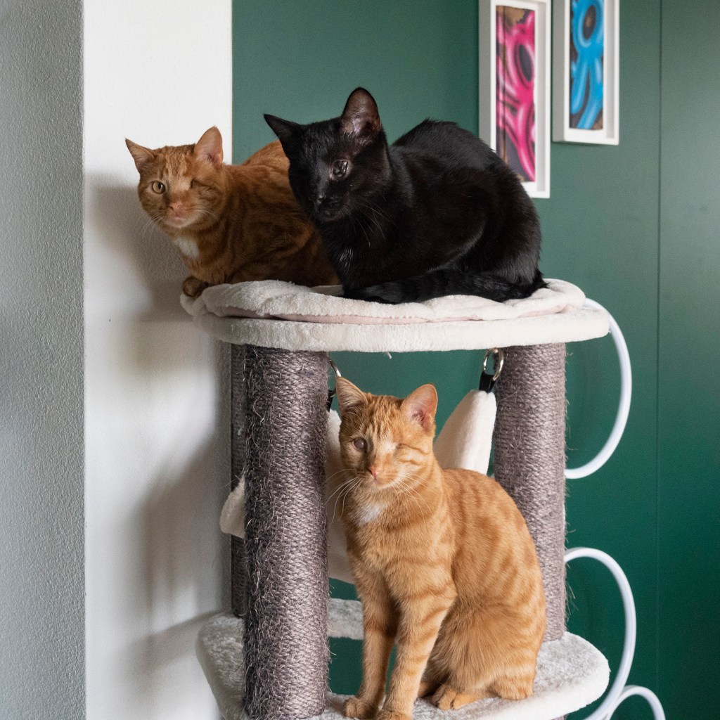 What that means is: for all intents and purposes, your blind cat will find food and litter as well as your sighted cat, although it might take them a little bit longer. Or it might not! Watch your cat when you bring them home. If you see them struggle with any of that – which is unlikely! – you can take steps to help them. My blindies haven’t missed their bowl or their litter box even once since we brought them home.